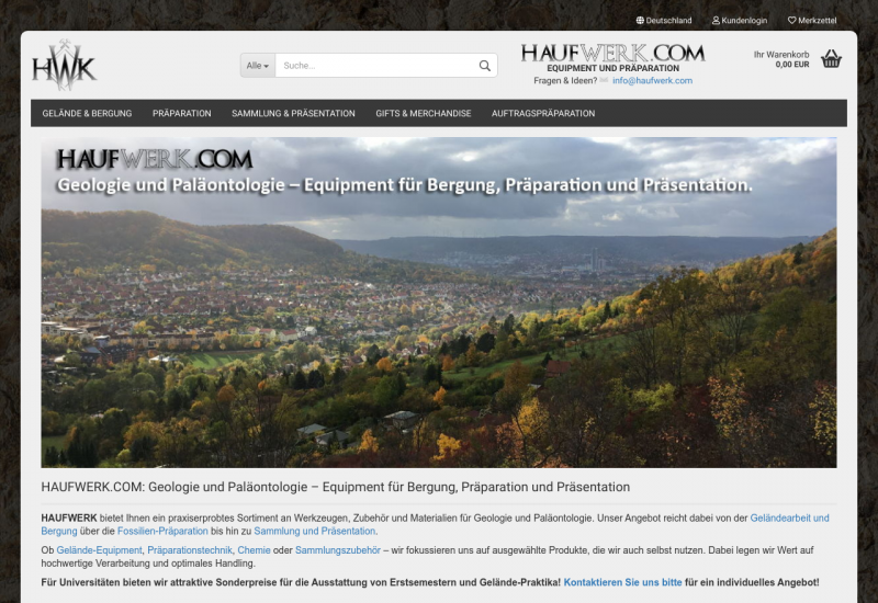 HAUFWERK bietet ein praxiserprobtes Sortiment an Werkzeugen, Zubehör und Materialien für Geologie und Paläontologie. Unser Angebot reicht dabei von der Geländearbeit und Bergung über die Fossilien-Präparation bis hin zu Sammlung und Präsentation.