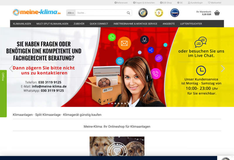In unserem Onlineshop finden Sie eine große Auswahl an Klimaanlagen (Klimageräte), Wärmepumpen, Installationszubehör vieler bekannter Markenhersteller zu besonders günstigen Preisen. Selbstverständlich bieten wir Ihnen auch einen Bundesweiten Montage und Inbetriebnahme Service zu einem fairen individuellen Festpreis. Für die ganz eiligen, finden Sie in unserem Klimaanlagen Onlineshop sogenannte "Quick Connect Leitungen" welche nur noch an die Innen -und Außeneinheit aufgeschraubt werden müssen. Persönliche und professionelle Kundenberatung vor -sowie auch nach dem Kauf steht bei uns an erster Stelle! Unser Team ist Mehrsprachig und Montag bis Samstag von 10.00 - 23.00Uhr für Sie per Live Chat, E-Mail, Fax oder per Telefon unter +49 (0) 30 3119 9125 für Sie erreichbar. Wir freuen uns auf Ihren Besuch in unserem Onlineshop und stehen Ihnen für weitere fragen selbstverständlich zur Verfügung.