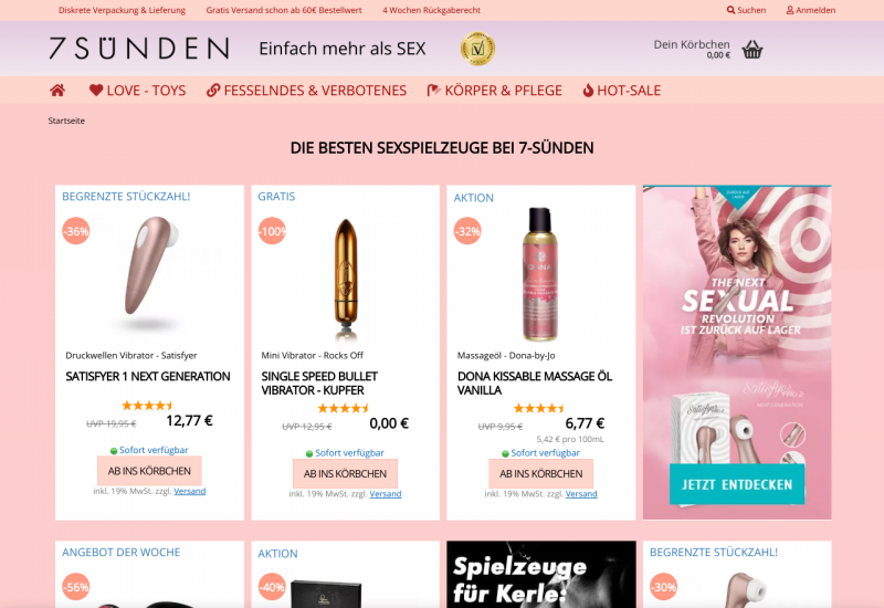 Mit über 5000 Produkten bietet unser neuer Onlineshop 7 SÜNDEN eine große Auswahl an Erotikspielzeugen für Erwachsene. Du liebst die Liebe? Willst immer noch eins mehr? 7 SÜNDEN ist einfach mehr als SEX. Dein Onlineshop für Liebe, Erotik und Abenteuer. Frech bunt und manchmal auch tabulos ;-) Du liebst es romantisch, aufregend oder bist ein Fetisch-Fan? Wir bieten ausreichend Inspiration für Frauen, Männer und Paare, haben tausende von heißen Sexspielzeugen diskret lieferbar auf Lager und viele Tips und Tricks zum Inspirieren und Ausprobieren.