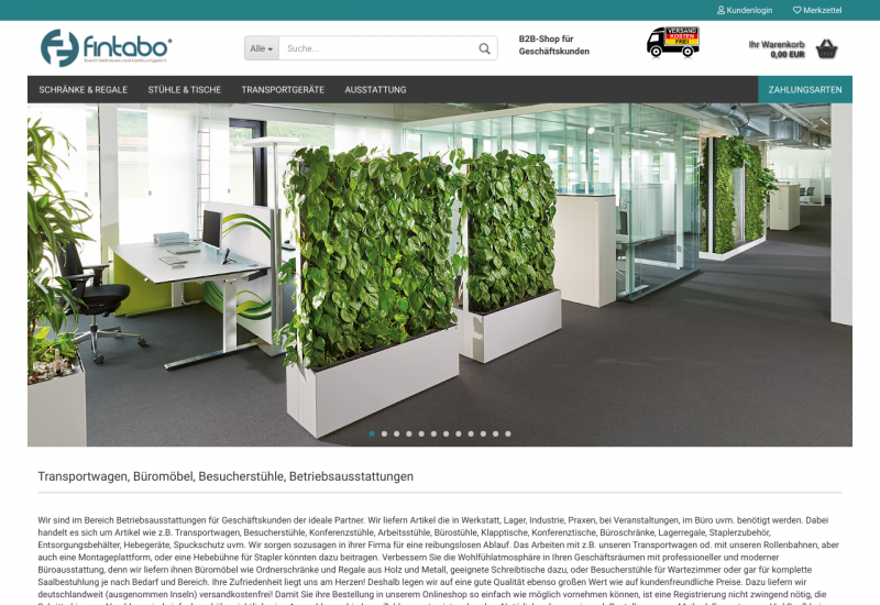 fintabo.de ist einen Online-Shop, der sich auf den Versand von Betriebsausstattungen spezialisiert hat. Die Angebote sind umfangreich wie z.B. Transportwagen, Besucherstühle, Werkzeugschränke, Reifenregale, Hygieneartikel, Absperrungen, Rammschutz uvm.