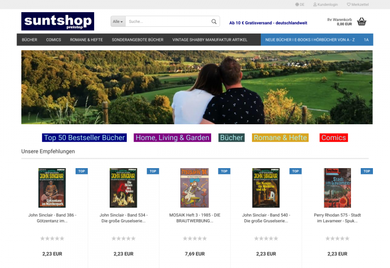 SuntShop - PreisTop - Ihr Online Shop für neue und gebrauchte Bücher, Hörbücher, E-Books, Home, Living & Garden Produkte. SuntShop - PreisTop - Ihr Onlineshop für neue und gebrauchte Bücher, Taschenbücher, Hefte und Magazine sowie E-Books und Hörbücher. Bei uns finden Sie eine sehr große Auswahl in den Themenbereichen: Literatur - Fiktion, Biografien, Erinnerungen, Business, Karriere, Börse, Geld, Comics, Mangas, Computer, Internet, Erotik, Fachbücher, Film, Kunst, Kultur, Geschenkbücher, Hörbücher, Freizeit, Haus, Garten, Krimis, Thriller, Lernen, Naturwissenschaften, Technik, Politik, Geschichte, Ratgeber, Reise, Sport, Fitness, Kochen, Genießen, Religion, Glaube, Esoterik, Fantasy, Science Fiction, Kinderbücher, Jugendbücher, Liebesromane und fremdsprachige Bücher. Weiterhin finden Sie bei uns Shabby chic VintageLandhaus Artikel in Handarbeit.