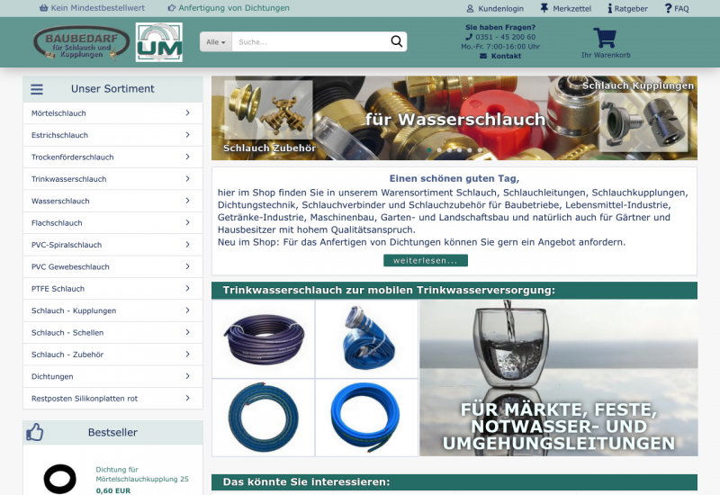 Im Shop finden Sie in unserem Warensortiment Schlauch, Schlauchleitungen, Schlauchkupplungen, Dichtungstechnik, Schlauchverbinder und Schlauchzubehör für Baubetriebe, Lebensmittel-Industrie, Getränke-Industrie, Maschinenbau, Garten- und Landschaftsbau und natürlich auch für Gärtner und Hausbesitzer mit hohem Qualitätsanspruch. Anfertigen von Dichtungen nach Ihren Vorgaben.