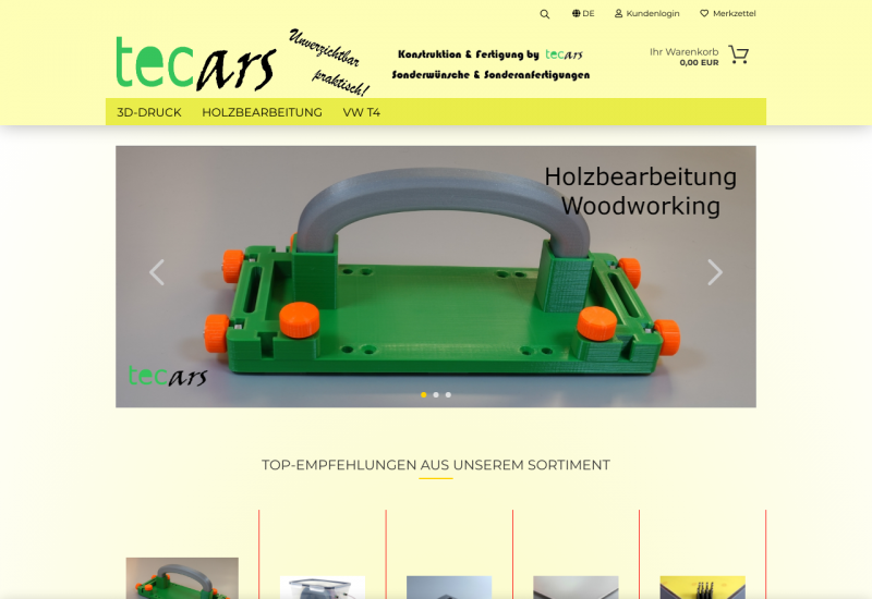 Wir von tecars sind Praktiker aus Überzeugung und investieren unser langjährig entwickeltes Know-how, unseren gesamten Enthusiasmus, all unsere Sorgfalt und Liebe zum Detail in Produkte, die das praktische Leben leichter, bequemer, besser und sicherer machen. Hierbei handelt es sich sowohl um technische als auch künstlerisch inspirierte, eigenständig konstruierte und im 3D-Druckverfahren hergestellte Produkte, die so bislang nicht am Markt erhältlich waren. Freuen Sie sich auf ausgeklügelte und bewährte Einfachheit, die auf jeden überflüssigen Schnickschnack verzichtet, zugunsten von hoher Qualität made in Germany, Langlebigkeit und Flexibilität. Jeder unserer Artikel ist auf Herz und Nieren im Praxiseinsatz getestet. Damit vermitteln Kunststofferzeugnisse aus dem Hause tecars ein ganz neues Gefühl in der (Hobby)Werkstatt, beim 3D-Druck, in der Holzbearbeitung, im Garten, in der Küche, beim Campen, für Ihren VW T4. Überzeugen Sie sich selbst: Ärgern war gestern!