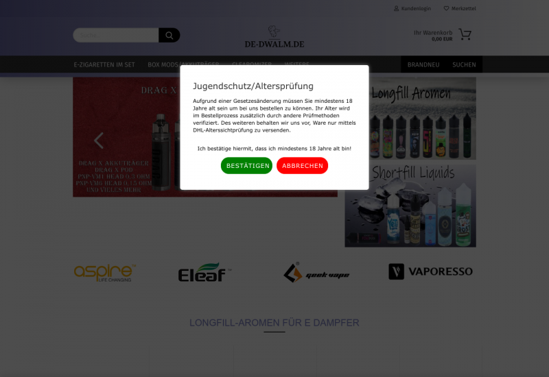 Online Dampfershop DE-DWALM (der Dampf) aus Ostfriesland, hier kannst Du E-Zigaretten sowie Zubehör, Liquids, Aromen, als auch Basen und Shot sicher und bequem online kaufen. Unser Sortiment bietet sowohl Produkte und Starter-Sets für Einsteiger, als auch raffinierte Dampfer-Artikel für erfahrene E-Zigaretten Nutzer.