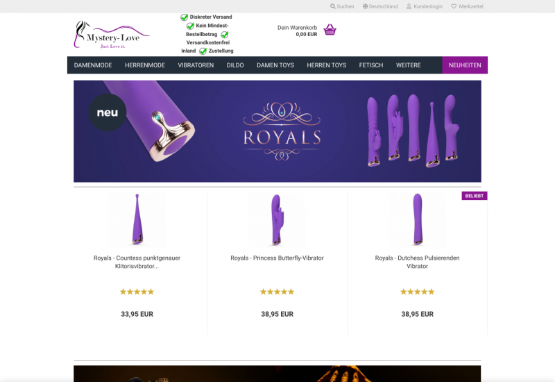Mystery-Love.de: Just Love it Der online Handel für all Ihre Sexartikel. In diesem Online Shop für erotische Artikel, finden Sie ein großes Sortiment an günstigen Sexartikeln, erotischer Kleidung und anderen Produkten, für spannende und erregende Momente. Frei nach dem Motto,"Just Love it" Wir sind auf spannende, aufregende, erotische Artikeln spezialisiert und bieten eine große Auswahl. In unserem Onlineshop können Sie günstig und online unter anderem Vibratoren, Dildos, Herren Lingerie, Damen Lingerie, Kondome, Gleitmittel, Düfte und herrliche Massageöle bestellen. Aber auch für viele andere Artikel, wie Masken, Latex und Bondage Artikel für ihre BDSM Vorlieben sind Sie beim Mystery-Love an der richtigen Adresse. Sehen Sie sich hier in Ruhe unser umfassendes Sortiment an preiswerten Sexartikeln und Accessoires an. Hier finden Sie das Richtige für ihren Erotischen Abend zu zweit oder alleine! Mystery-Love, der online Handel für all Ihre Sexartikel. Just Love it.