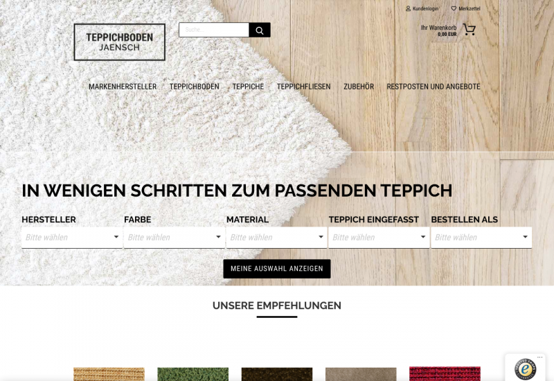 Teppichboden-Online-Shop.de - Teppichböden und Teppiche im Wunschmaß Der Shop vereint Fachberatung und Handwerkskunst in einem modernen Shop. Das Angebot reicht von namhaften deutschen Teppichmarken wie Vorwerk oder Tretford zu nachhaltigen und widerstandsfähigen Teppichböden aus Naturfasern. Ebenso bietet teppichboden-online-shop.de exklusive Teppichböden aus Skandinavien und Belgien an. Im Luxussegment werden exklusive Böden aus Schurwolle und Kaschmir-Ziegenhaar verkauft. Besonders ist der Service. Nahezu alle Teppichböden können individualisiert werden: als Wunsch-Maß, als Wunsch-Zuschnitt oder mit Wunsch-Kettel oder -Bordüre. Der Shop kombiniert 30 Jahre Erfahrung im Handwerk mit moderner Produktionstechnik. Vorteile: Fachberatung Individualisierung Großes Sortiment
