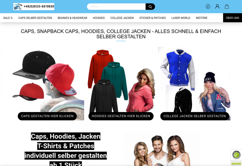 Wir bieten aktuelle Trendwear an, die der Kunde im Shop nach seinen Vorstellungen selber gestalten kann. Ganz gleich ob Caps, Hoodies, Collegejacker, T-Shirts uvm. - alle Produkte können individuell gestaltet und ab Stückzahl 1 bestellt werden.