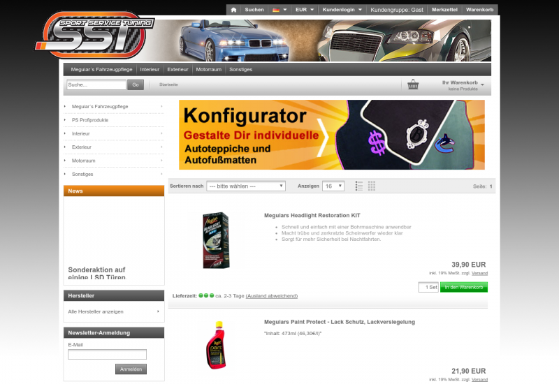 Sport-Service-Tuning sieht sich selbst als kompetenter und umfassender Dienstleister im Tuning Bereich und wird Ihnen gern mit Rat und Tat jederzeit zur Seite stehen. Seit der Firmengründung 2004 hat sich Einiges getan. Nach unserem Umzug im Herbst 2007 und mit dem nun eröffneten Ladengeschäft und anschließenden Lagerräumen & Produktionsräumen stehen uns noch mehr Möglichkeiten offen, um Ihre Wünsche umzusetzen. Benötigen Sie Hilfestellungen zu verschiedenen Produkte, passt das Produkt für Ihr Auto, benötigt man TÜV-Zulassung etc... ? Kontaktieren Sie uns gern jederzeit per e-Mail oder Telefon, wir helfen weiter - schnell und unkompliziert.