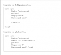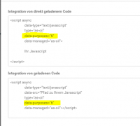 Du musst da, wo Du den Code des Anbieters einbindest (bei jedem video, oder Global in den Tracking-codes, oder da, wo Du den Chat installiert hast.....) die Verbindung zum Consent-Tool einfügen. Dazu legst Du zunächst im Consent-Tool für jeden Bereich einen eigenen Zweck an (Google-Analytics über Gambio kann man einfach aktivieren) Achte auch auf die richtige Kategorie. Wenn Du einen neuen Zweck angelegt hast, ist in der Zeile hinten ein Dropdown: Bearbeiten -> Löschen -> Integration anzeigen Gehe auf "integration anzeigen" Da kommt ein PopUp, das etwa den Inhalt hat: Das gelb markierte ist Deine ID für diesen einen Zweck, der ist wichtig. Der Ganze Code ist ein Beispiel, wie das im Original-Code geändert, bzw. hinzugefügt werden muss. Hier: (Link nur für registrierte Nutzer sichtbar.) findest du eine ganze Reihe fertiger Codes, wo Du nur die Nummer (und gegebenenfalls Deine pers. Daten) ändern musst.