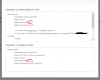 Den Analytics Code habe ich im Cookie Consent Tool -> Google Analytics -> Integration anzeigen oben bei Direkt geladenem Code eingeben. Dort stand " data-purposes="4" ". Der gleiche Code / Script taucht dann im Cookie Consent Tool -> Google Analytics -> Integration anzeigen bei dem Google Recaptcha auf. Dort steht dann oben auch die "4" und - wie man sieht - unten die 3. Versuche ich hier die 4 in eine 3 zu ändern, ändert sich das dann aber auch in dem Code für Analytics in eine 3.
