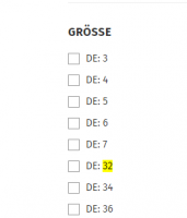 Da ja alle Bezugspunkte für Größen auf einer Größentabelle liegen kann man doch alle Größen in Bildern auch rechts nebeneinander wie Farben platzieren - könnte ich dafür auch wie die Farben als Größen definieren? Der CSS Code würde doch nahezu auch so eingetragen werden oder nicht? Was meint ihr, würde das gehen bzw. was wäre zu beachten? <input type="checkbox" id="filter_22_34" name="filter_fv_id[22][]" value="34" data-single_checkbox="" checked="checked" style="position: absolute; left: -100000px;">