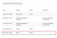 Das ist u.E. dringend nötig. Aktuell müssen wir bei einer (Teil-) Rückerstattung den Prozess immer 2x anstoßen, damit am Ende der Betrag auf 0 und im Kommentar "Betrag reduziert" steht. Mag sein, dass dein ein zeitlicher Verzug bei der Kommunikation mit Klarna ist, aber wir können das ja nicht jedesmal später noch einmal kontrollieren, ob das wohl auch geklappt hat oder nicht?!?!? Das kann ja so noch gewollt sein.