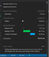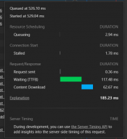 Wir sehen: 526ms nach initialem Aufrufbeginn hatte der Browser die Idee zusammen, nach 529ms die Anfrage abgeschickt, musste dann 117ms warten bis eine Antwort vom Webserver mit dem Shop übers Netz einzutreffen begann, bis dann nach weiteren 63ms alles davon komplett da war. Der ganze Prozess hat 185ms gedauert.