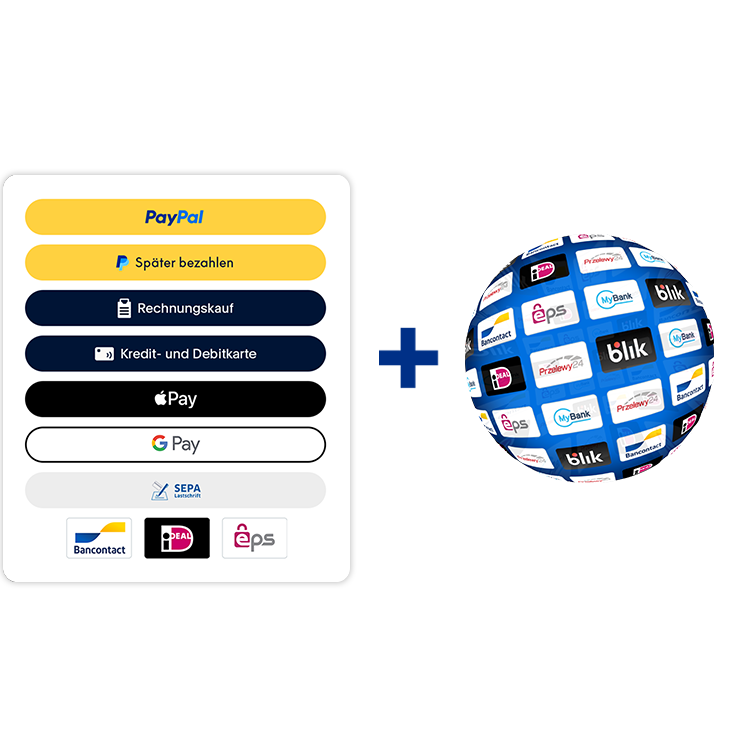 Optimiere deine Geschäftsabläufe mit einer einfachen, aber leistungsstarken Lösung. Mit der PayPal Checkout-Integration bietest du deinen Kund:innen die Möglichkeit, PayPal „Später bezahlen“-Optionen1, SEPA-Lastschrift, Rechnungskauf1, Apple Pay®, Google Pay™ und Debit- und Kreditkarten zu nutzen. Zudem kannst du lokale Zahlarten anbieten, um deinen Kund:innen gewohnte Optionen zu bieten.